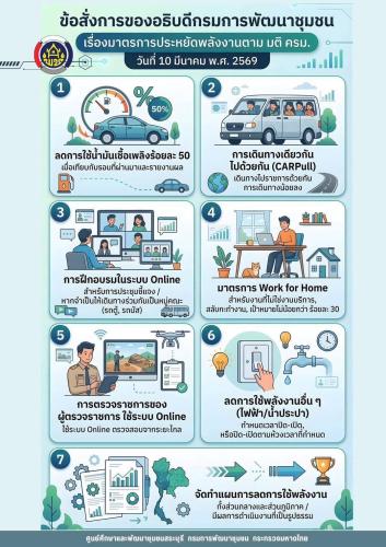 สำนักงานพัฒนาชุมชนอำเภอแม่สรวย จังหวัดเชียงราย น้อมรับมติคณะรัฐมนตรี (ครม.) และข้อสั่งการของอธิบดีกรมการพัฒนาชุมชน เมื่อวันที่ 10 มีนาคม 2569 ในการขับเคลื่อนมาตรการประหยัดพลังงานอย่างเคร่งครัด เพื่อเตรียมความพร้อมรับมือสถานการณ์ความผันผวนด้านพลังงานโลกครับ/ค่ะ